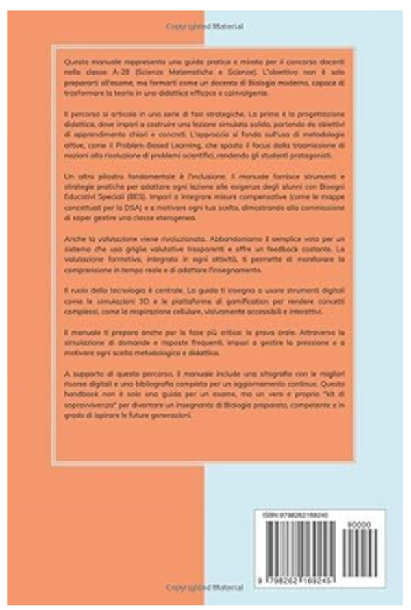Questo manuale è una guida completa e pragmatica, nata dalla consapevolezza che il superamento del concorso docenti per la classe A-28 (Scienze Matematiche e Scienze) richieda una preparazione che vada oltre la semplice conoscenza disciplinare. L'obiettivo è fornire al candidato gli strumenti teorici e applicativi per affrontare con successo la prova orale, trasformandola da un esame mnemonico a una dimostrazione di professionalità didattica. Il manuale si propone di costruire, pezzo dopo pezzo, la figura di un insegnante moderno, competente e consapevole.